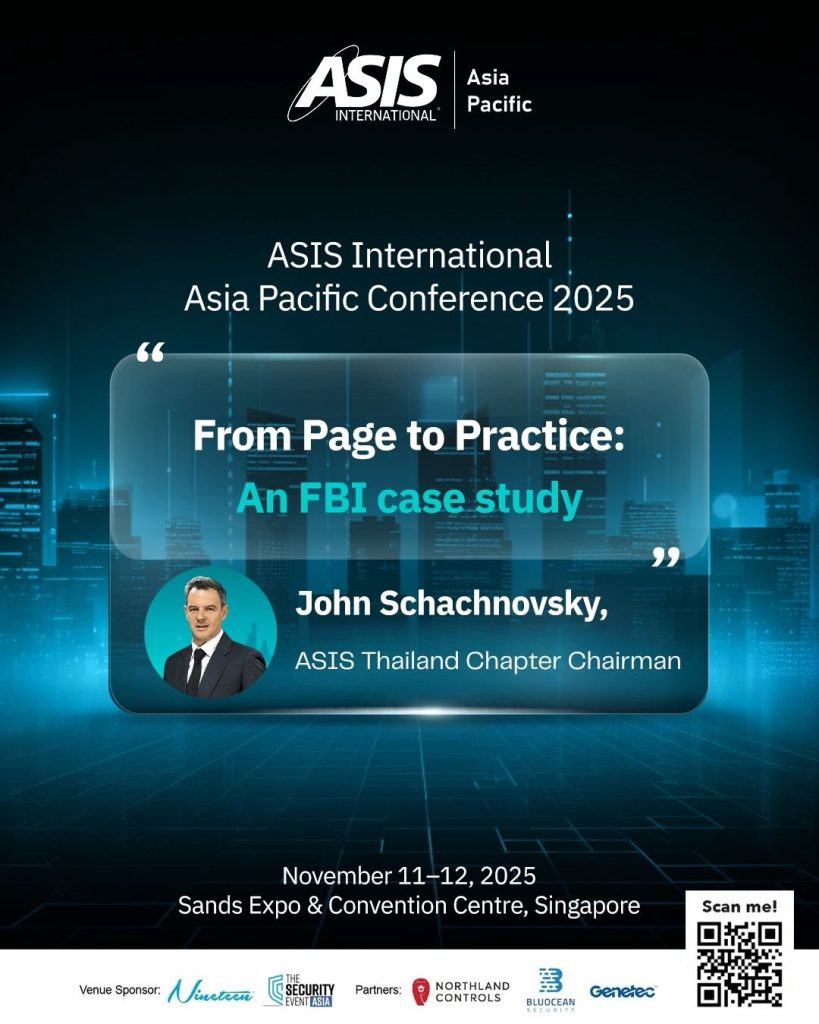 John Schachnovsky From Page to Practice: An FBI Case Study Register now: asisapac.org Join John Schachnovsky, ASIS Thailand Chapter Chairman and former FBI Special Agent, for an insightful session on “From Page to Practice: An FBI Case Study” at the ASIS International Asia Pacific Conference 2025, taking place 11–12 November at the Sands Expo & […]